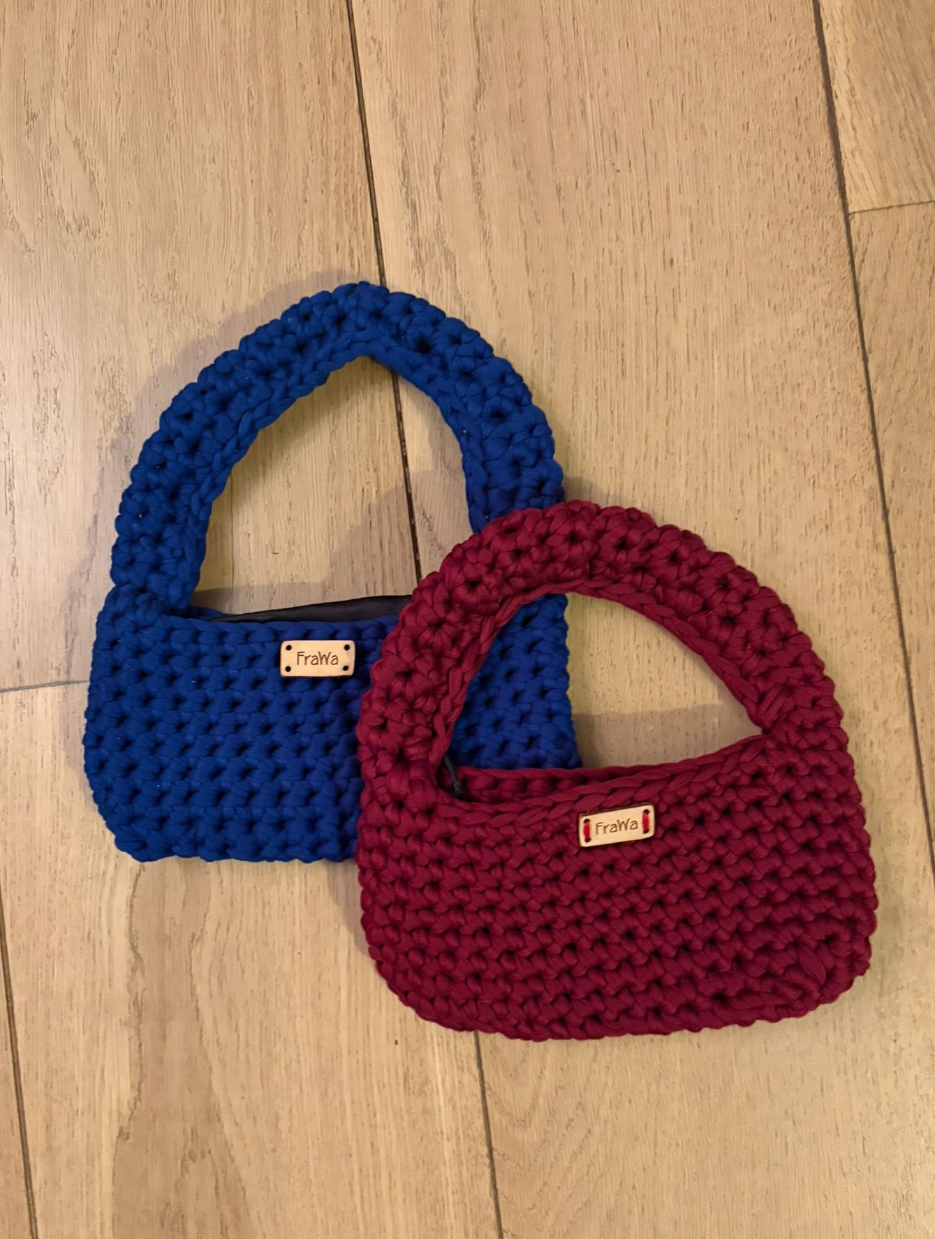 Feestelijke avondtasjes in de kleuren blauw en bordeaux. Gemaakt van het T-shirt stof